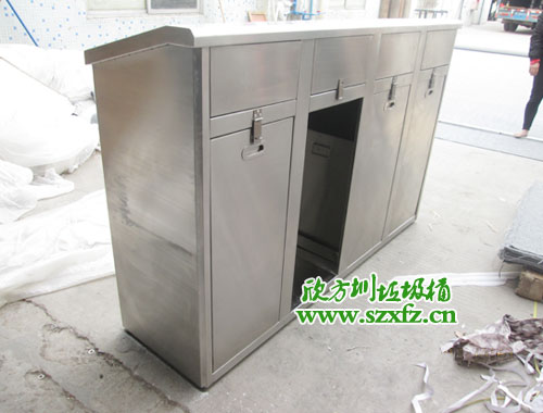 深圳師范學院附屬中學款式的C170五分類環?;厥障?/span>規格為:1600*400*860mm.外表是一款全新不銹鋼材質打造而成.不銹鋼垃圾桶頂部有五個垃圾投放組合,圓形垃圾投口分別左,右,中間,還有兩個半圓在中間部位。不銹鋼垃圾桶正面開有五個門,每一個門前都有一個小鑰匙配套開門。正面中間橫幅有LOGO的標準,還有深圳大學師范學院附屬中學字樣及英文拼音字母組合而成。不銹鋼垃圾桶五個取放垃圾內膽正門,絲印有五個垃圾投放標志。從左到右依次回收塑料罐,金屬罐,利樂包,紙張,有害垃圾及標志。不銹鋼垃圾桶外觀為方形,具有獨特的堅固耐用,不易破損;耐火安全,抗高低溫等優勢。適合各大院校,高檔場所使用。