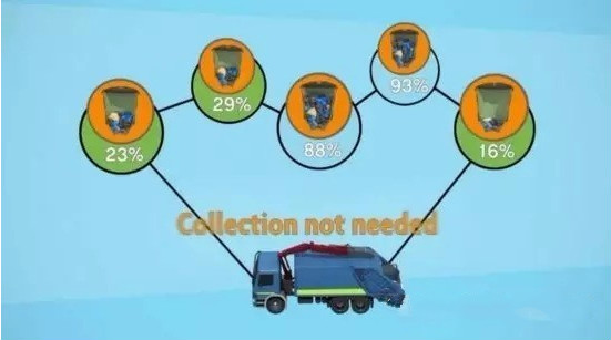Enevo ONe作為一個基于超聲波傳感器的廢物回收系統。傳感器將收集到的垃圾箱和垃圾回收地的傳感數據通過低功耗的LoRa網絡傳輸到數千米外的LoRa基站,再傳送到服務器。通過分析這些數據,垃圾管理者能更直觀的了解轄區內各個垃圾桶的填充狀態,并為清潔的車輛規劃最佳的回收路線,從而節省環衛機構的運營成本。