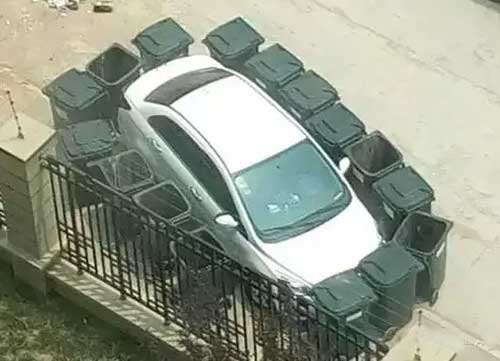 垃圾桶不用來裝垃圾,卻被拿來“圍堵綁架”小轎車