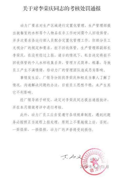 動(dòng)力廠一名工作人員提供的一份《關(guān)于對李榮慶同志的考核處罰通報(bào)》顯示,該廠生產(chǎn)管理部提出就餐室的水杯等個(gè)人物品在非工作時(shí)間由個(gè)人回收保管,但部分員工無視此規(guī)定和要求,拒不回收保管。李榮慶在沒有經(jīng)過上報(bào)請示的情況下,私自決定將拒不回收保管的個(gè)人水杯收集丟棄,管理方式簡單粗暴,導(dǎo)致員工產(chǎn)生不滿情緒,給動(dòng)力廠的管理團(tuán)隊(duì)造成惡劣影響。