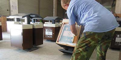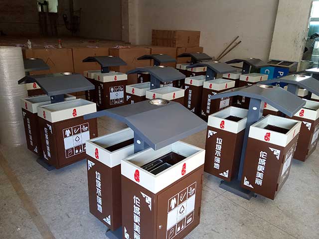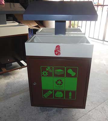 欣方圳鋼制戶外四分類垃圾桶產品一律用室外粉靜電噴塑,經過180°的高溫使垃圾桶顏色持久不變,亮麗如新