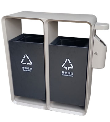 深圳福田城市形象更新戶外分類垃圾桶側面煙灰柱滅煙及煙蒂收集使用定制設計,絲印新版可回收物、其他垃圾分類標識,前后搖擺分類桶桶身取出內桶清運垃圾。底座預留孔位與地面固定,安全防傾倒。