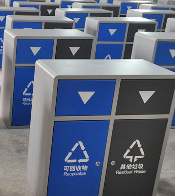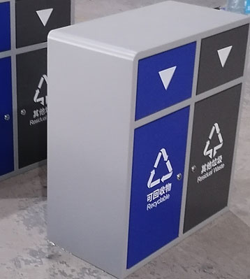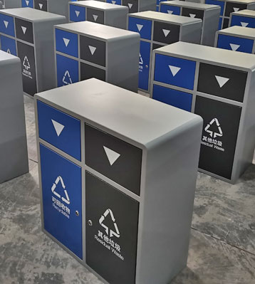 方形外觀兩分類垃圾投放口,欣方圳采用激光切割焊接成型,邊角精細打磨拋光,配鍍鋅內桶防銹耐腐蝕,桶身分類標識醒目,戶外塑粉表面烤漆工藝戶外防銹不褪色耐用。